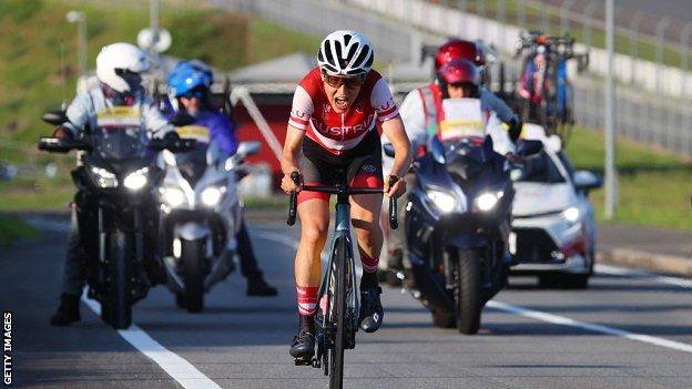 Anna kiesenhofer of team austria celebrates winning the gold medal on day two of the tokyo 2020 olympic games at fuji international speedway on july 25, 2021 in oyama, shizuoka, japan.